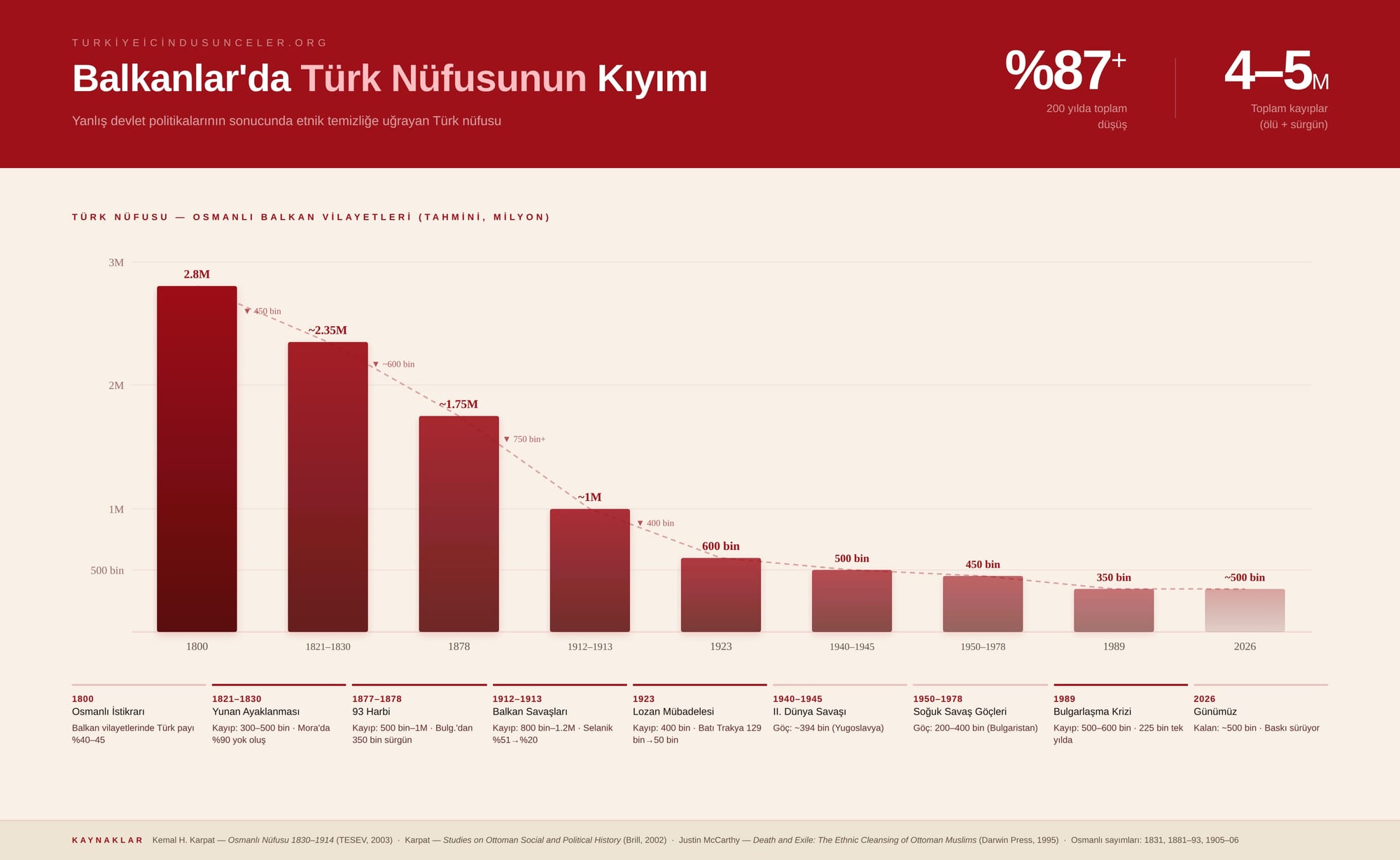 Balkanlarda devlet, çökmekte olan İmparatorluğumuzu kapsayıcı bir kimlikle bir arada tutmaya yönelik çaresiz bir girişim olan Osmanlıcılık’ta Türk milletinin çıkarlarına aykırı olmasına rağmen diretti. Sonuç, mutlak bir yıkım oldu: Gayri Türk anasır isyan ettiler, yabancı güçlerle işbirliği yaparak bizim topraklarımızdan kendilerine yeni vatanlar yarattılar. Türklerin asırlarca yurdu bildiği, kimi yerlerde çoğunluğu kimi yerlerde köklü bir azınlığı oluşturduğu Balkanlardaki Türk varlığı yok edildi. Milyonlarca Türk can verdi; geri kalanlar perişan halde Anadolu'ya iltica etti.